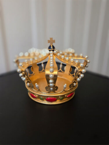 De kroon is gemaakt van messing met koperen details en heeft een diameter van 25 centimeter aan de buitenzijde, een hoogte van ongeveer 15 centimeter en een gewicht van bijna 2 kilogram. De aangebrachte versieringen van randjuwelen, rozetten en de koningsappel zijn gekleurd met rode, blauwe en groene kunststof. Ook zijn er 88 parelkralen gebruikt en is de kroon zelf verguld met bladgoud.